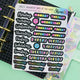 This listing is for one sheet of months stickers featuring hand lettering and typography layered over black. These are perfect for blackout planning!