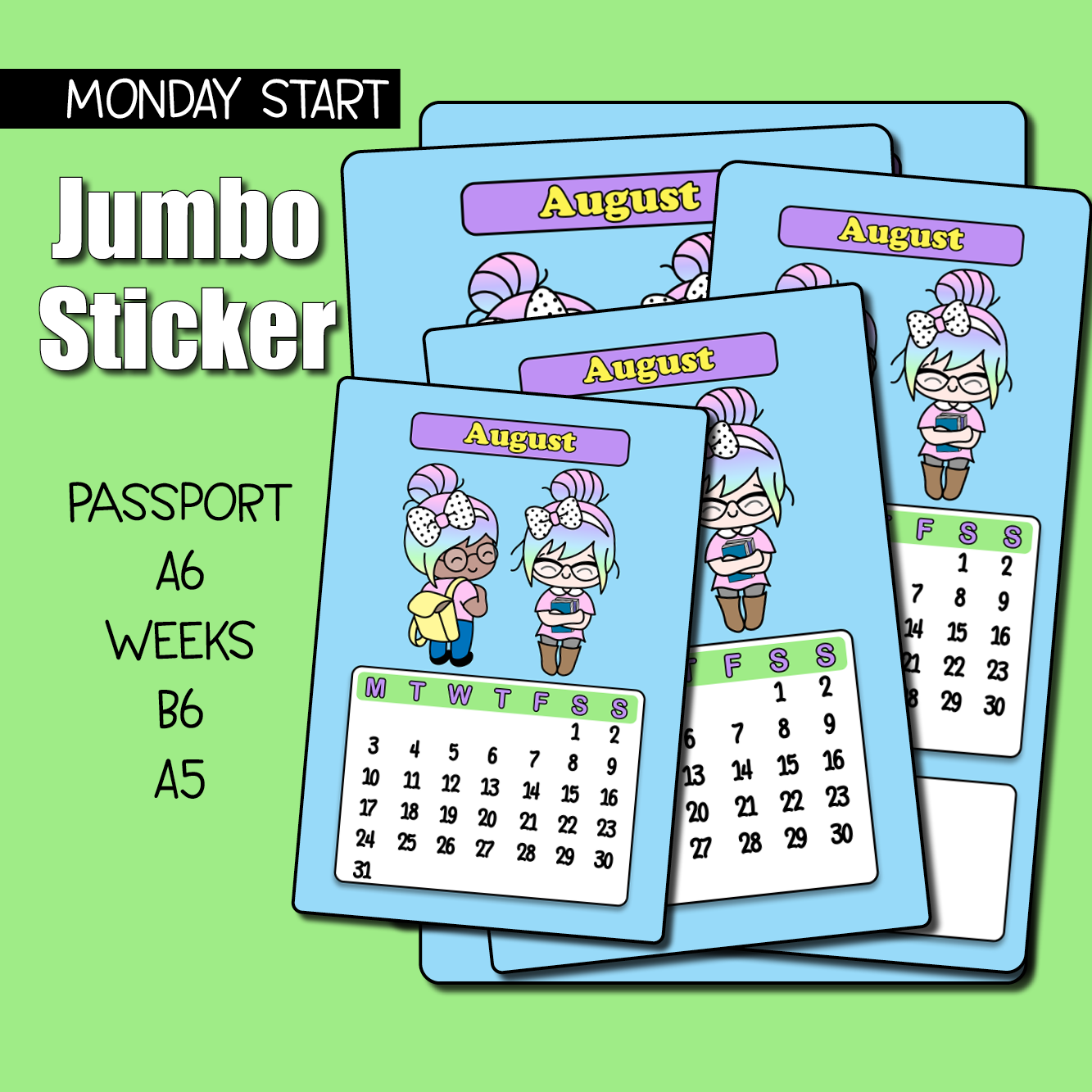 Use this big sticker to cover a page in your planner or bullet journal so you'll have the cutest spot for decorating each month of 2026! These are sized slightly smaller than the page, allowing for margins which makes for easier placement and centering. Choose your jumbo sticker sized from the following standard sizes: Passport, A6 (Hobonichi), Weeks (Hobonichi, TAS), B6, and A5 (Hobonichi Cousin).