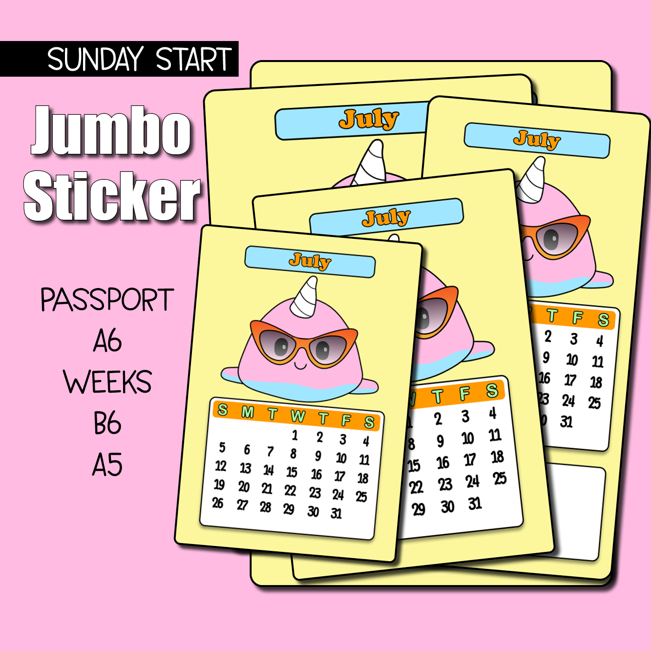 Use this big sticker to cover a page in your planner or bullet journal so you'll have the cutest spot for decorating each month of 2026! These are sized slightly smaller than the page, allowing for margins which makes for easier placement and centering. Choose your jumbo sticker sized from the following standard sizes: Passport, A6 (Hobonichi), Weeks (Hobonichi, TAS), B6, and A5 (Hobonichi Cousin).
