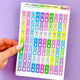 This listing is for one sheet of date cover stickers specifically sized for the Hobonichi A6 daily pages, formatted for both the English and Japanese A6 Hobonichi books. Each sheet comes with a week's set of date covers plus mini checklists, "to do"s, and functional skinny washi strips that you can use to divide the space in your daily pages.
