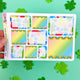 This sticker sheet features the words "Happy Anniversary" in rainbow colored bubble letters. There are some all on one line at .27" tall by 2" wide and some on two lines at 1.6 wide. There are 12 stickers on the sheet.