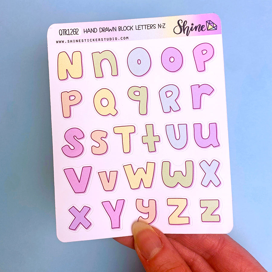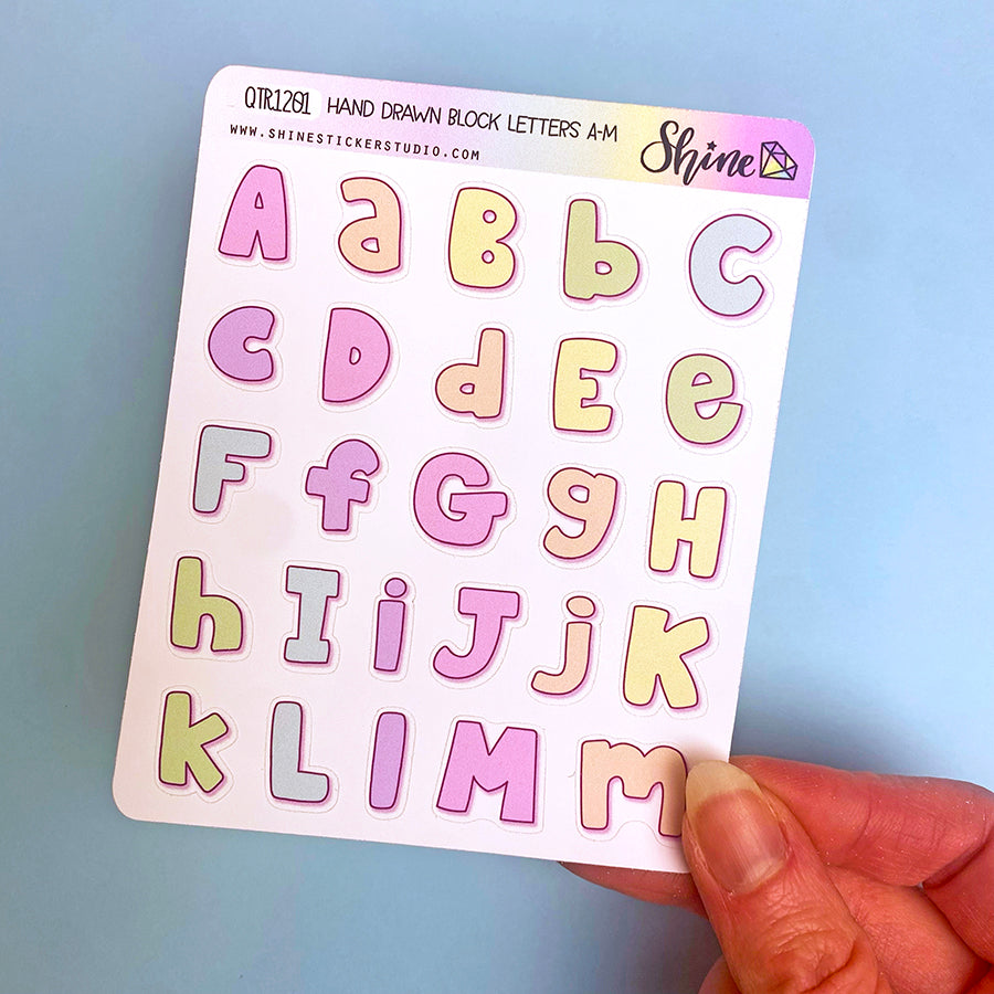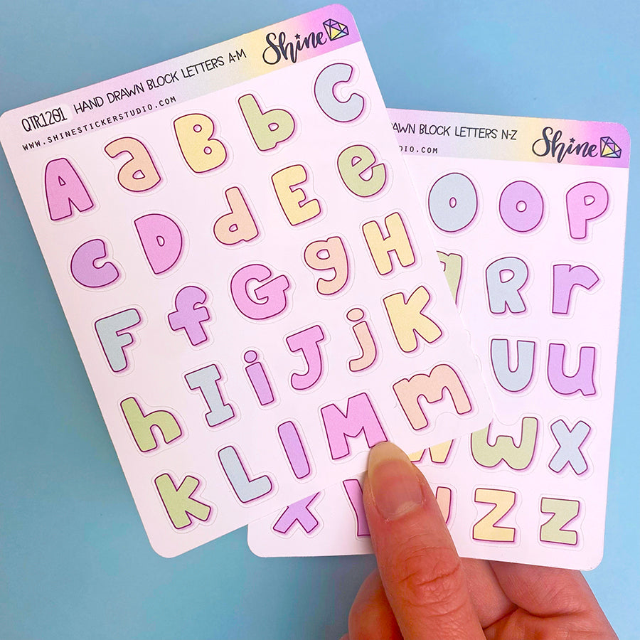 This listing is for our new hand drawn block letter stickers available in a pastel rainbow color palette. The letters are about .75" tall