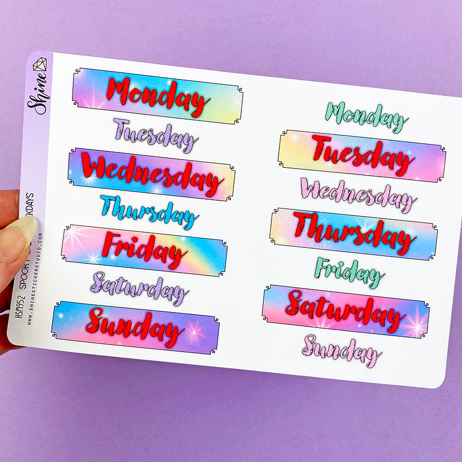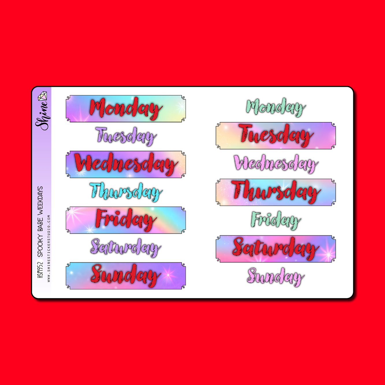 This listing is for a sheet of two sets of weekday stickers that match our Spooky Babe collection. The longest one is 2.75" long.