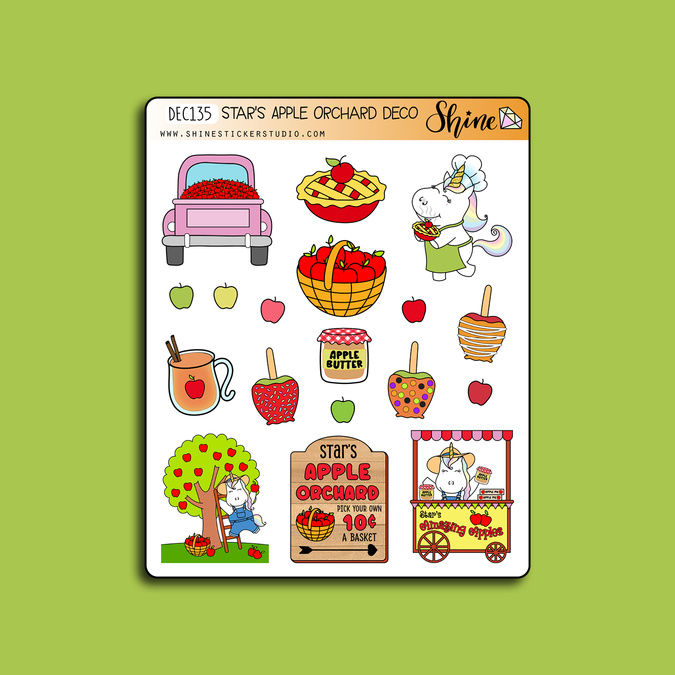 Join Star the Unicorn on a delightful adventure through her apple orchard with these adorable decorative stickers. Star's Apple Orchard Decorative Planner Stickers captures the charm of apple picking, baking sweet apple pies, making apple butter and cider, plus indulging in candy apples. Add fun and whimsy to your weekly planning with stickers that bring harvest magic and cozy autumn moments right to your pages.