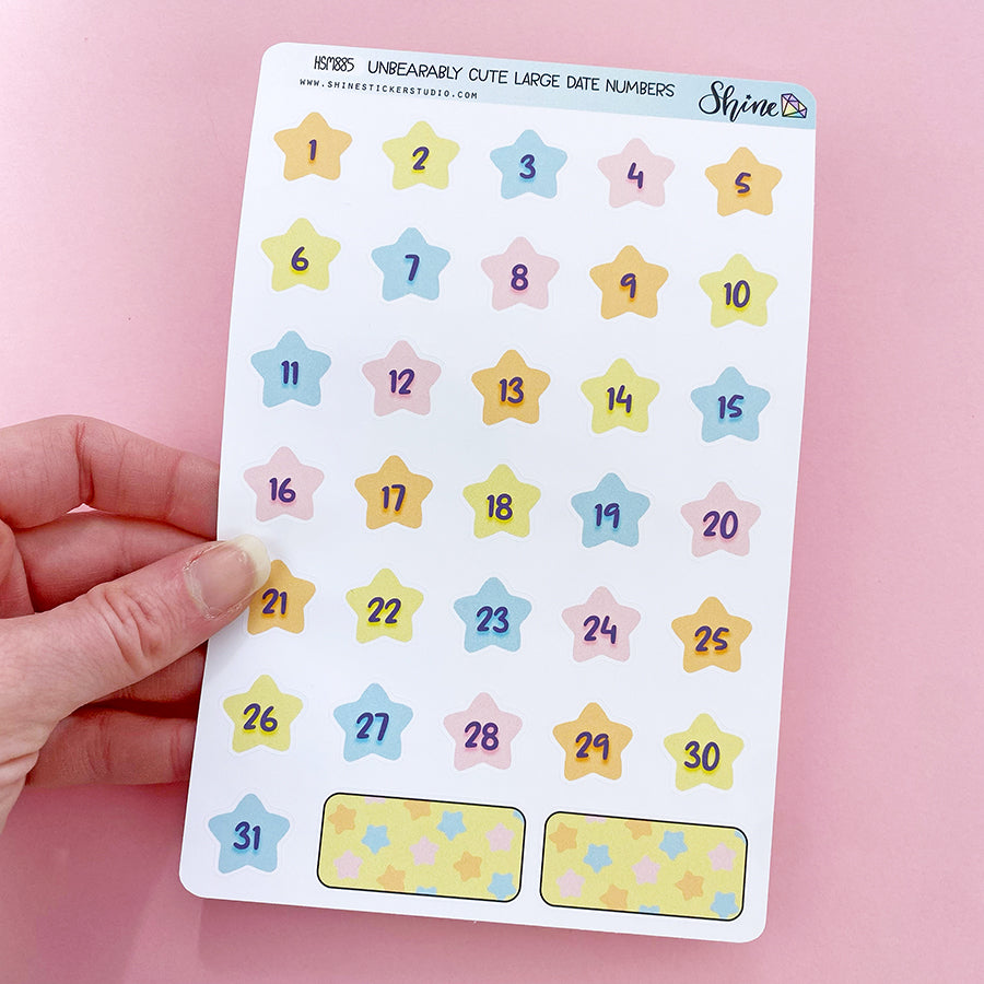 This listing is for decorative date number stickers that match our Unbearably Cute collection. There are a full month of stickers on the sheet, plus a couple boxes you can write in. These are about .75" tall.