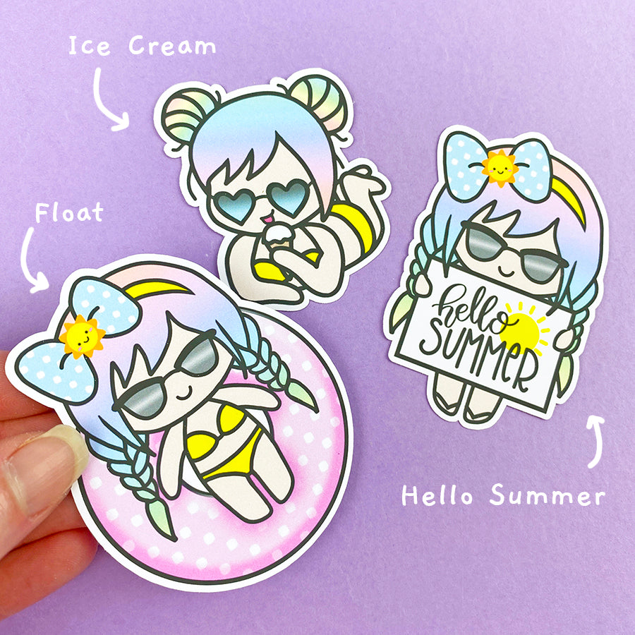 This is our original sticker die cut set from our old Luna Pool Day collection . These are hand-drawn and our original design so you can't find them anywhere else! About 3". Purchase individually or all 3 for a discounted price.