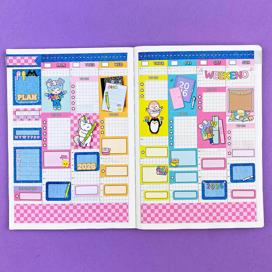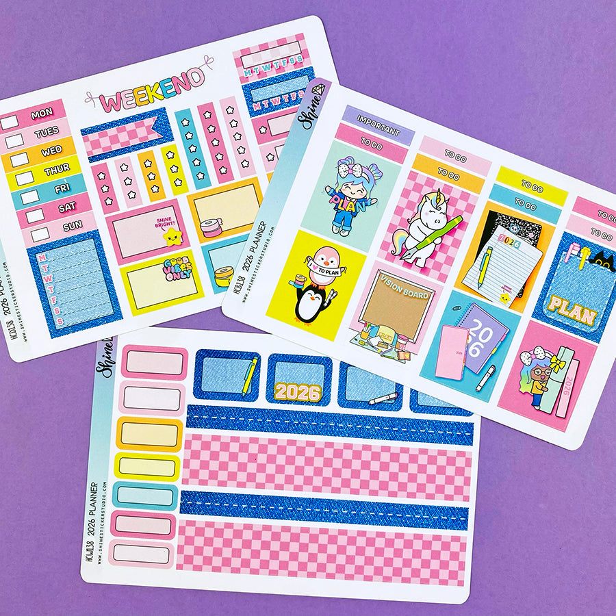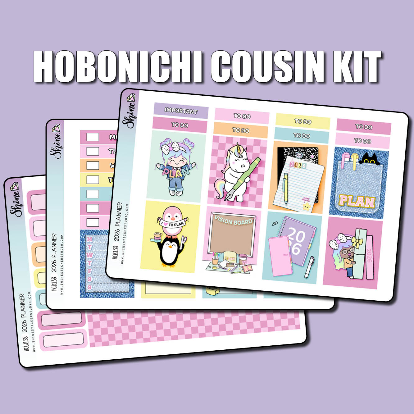 This adorable 2026 planner-themed kit is specifically designed for one weekly spread in your Hobonichi Cousin planner. Artwork in this kit was hand-drawn by us and features our shop characters Luna, Star, Popsicle, Pickle, and Edgar.