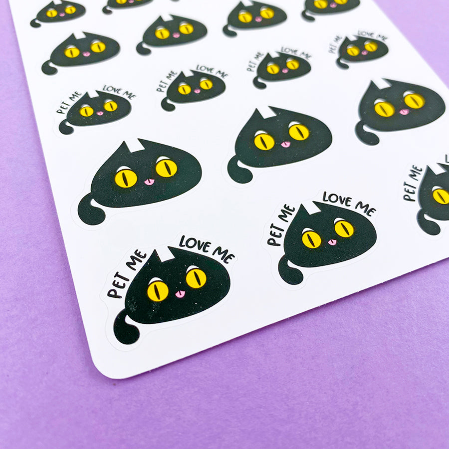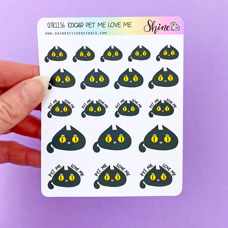 This listing is for one sheet of these adorable kitty cat stickers featuring our Character Edgar eagerly waiting for more pets! Like most cats, he can't get enough! He looks like he has a slick back seal face like when you pet him and his face is pulled back as if the pony tail is too tight. LOL Some of the stickers have the words "Pet Me Love Me" added to them.