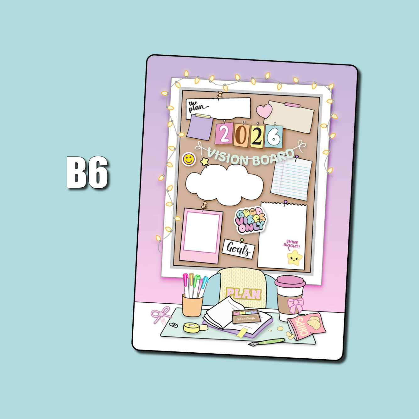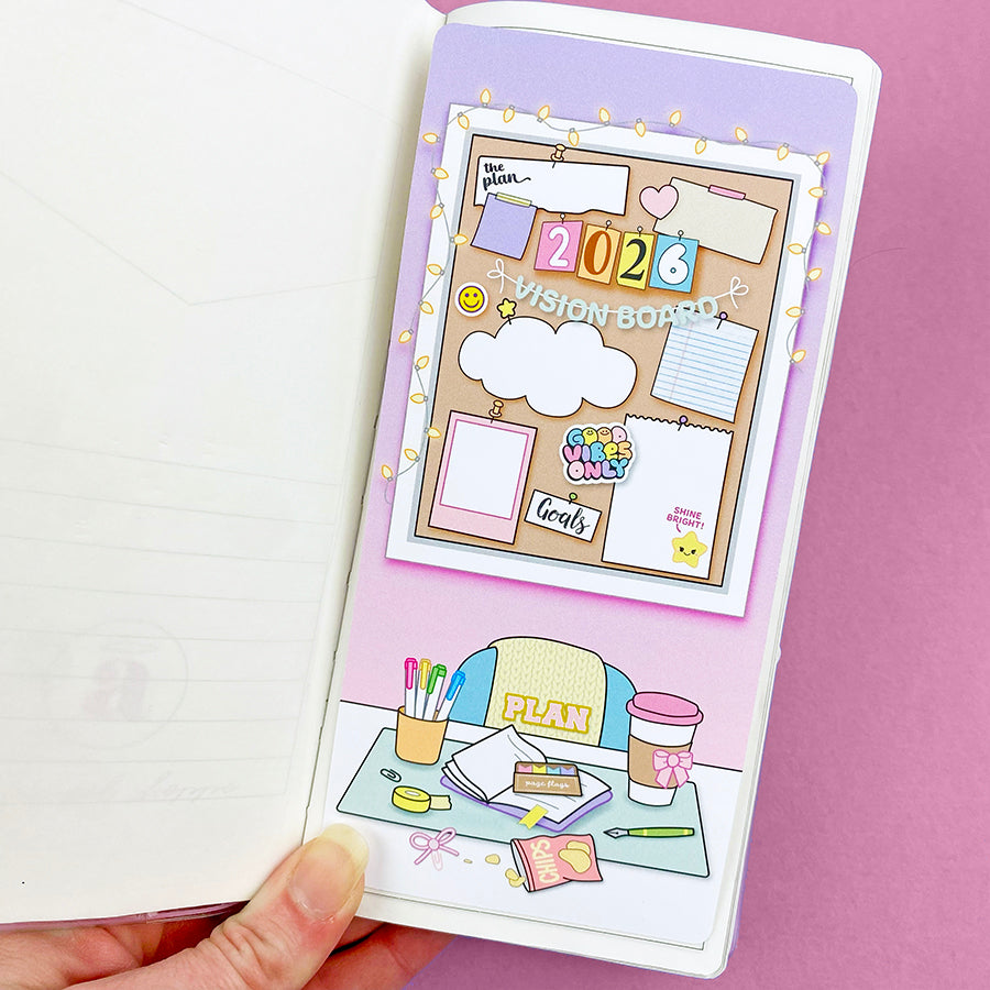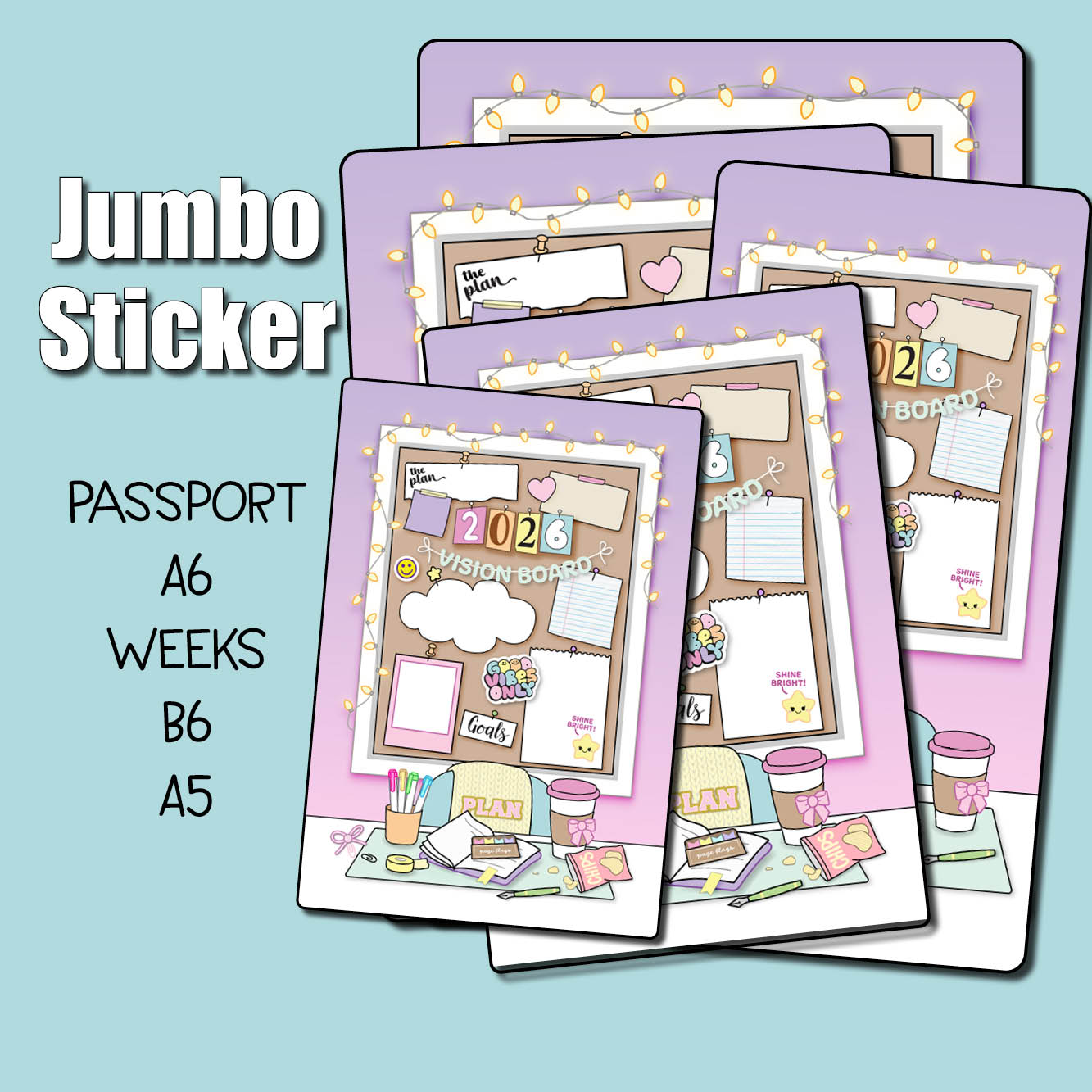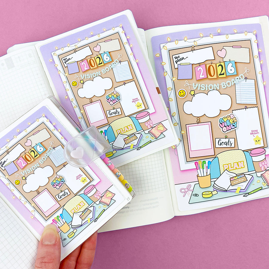 This listing is for our full page 2026 Vision Board sticker. Use this big sticker to cover a page in your planner or bullet journal so you'll have the cutest spot for planning your goals for the new year! These are sized slightly smaller than the page, allowing for margins which makes for easier placement and centering. Choose your jumbo sticker sized from the following standard sizes: Passport, A6 (Hobonichi), Weeks (Hobonichi/PP), B6, and A5 (Hobonichi Cousin).