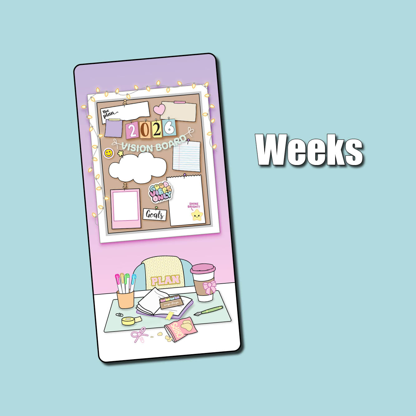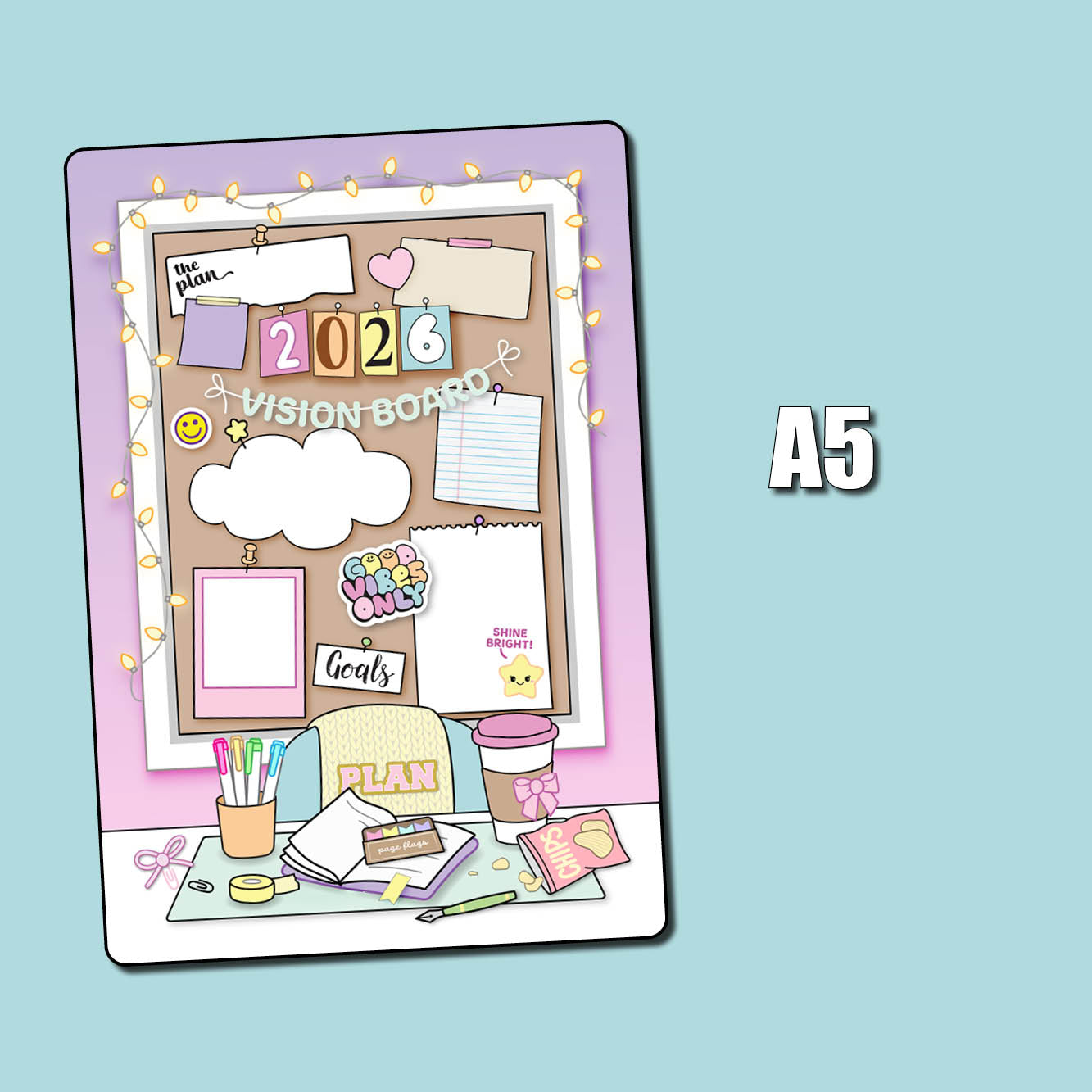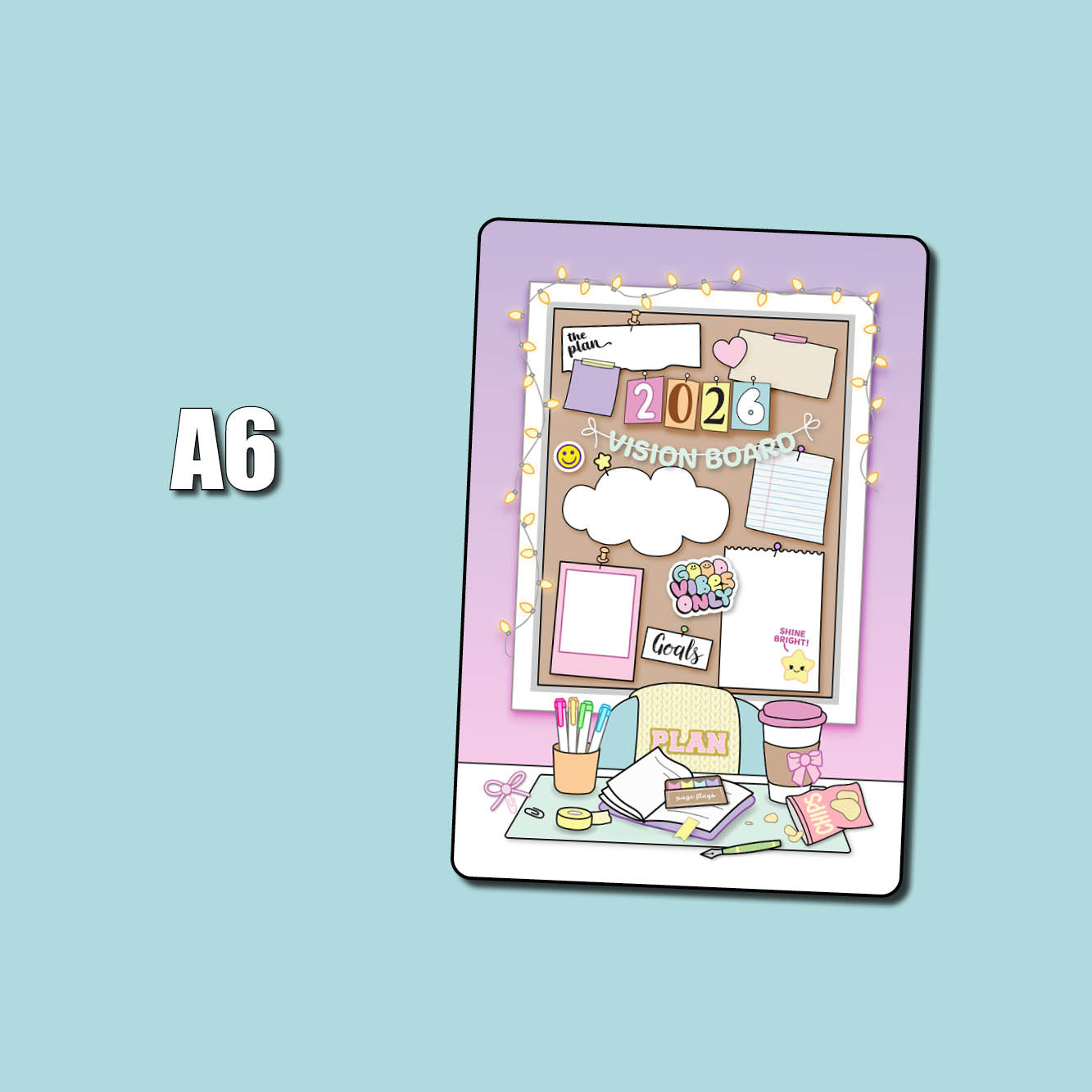 This listing is for our full page 2026 Vision Board sticker. Use this big sticker to cover a page in your planner or bullet journal so you'll have the cutest spot for planning your goals for the new year! These are sized slightly smaller than the page, allowing for margins which makes for easier placement and centering. Choose your jumbo sticker sized from the following standard sizes: Passport, A6 (Hobonichi), Weeks (Hobonichi/PP), B6, and A5 (Hobonichi Cousin).