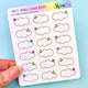 This listing is for a sheet of sweets washi strip stickers. These feature elements from our sweets bujo stickers. These washi strips are all 6.433" long, and come in three thicknesses: 1.125", .37" and .2". There are two strips for each size for a total of six. These are perfect for larger planners such as the Recollections, Happy Planner, Erin Condren and more.