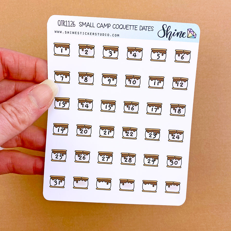 This listing is for one sheet of smores number stickers that match our Camp Coquette collection. There is one month's worth of numbers on the sheet (1-31) plus four blank smores. Approximately .5".