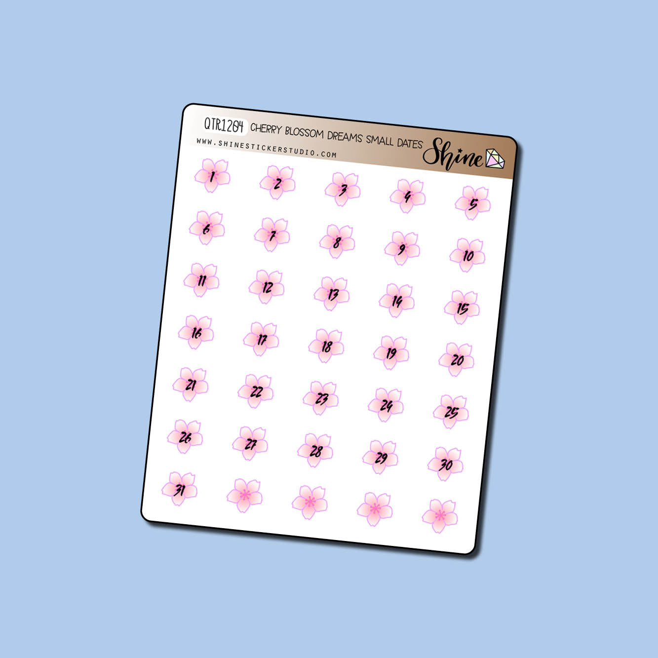 This listing is for one sheet of pretty sakura cherry blossom date number stickers that match our Cherry Blossom Dreams collection. There is one month's worth of numbers on the sheet (1-31) plus four blank. Just under .5" tall.