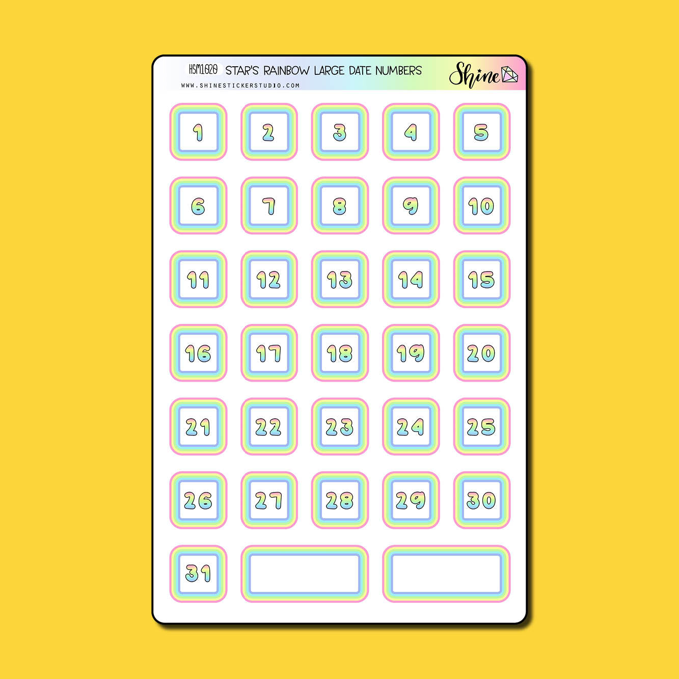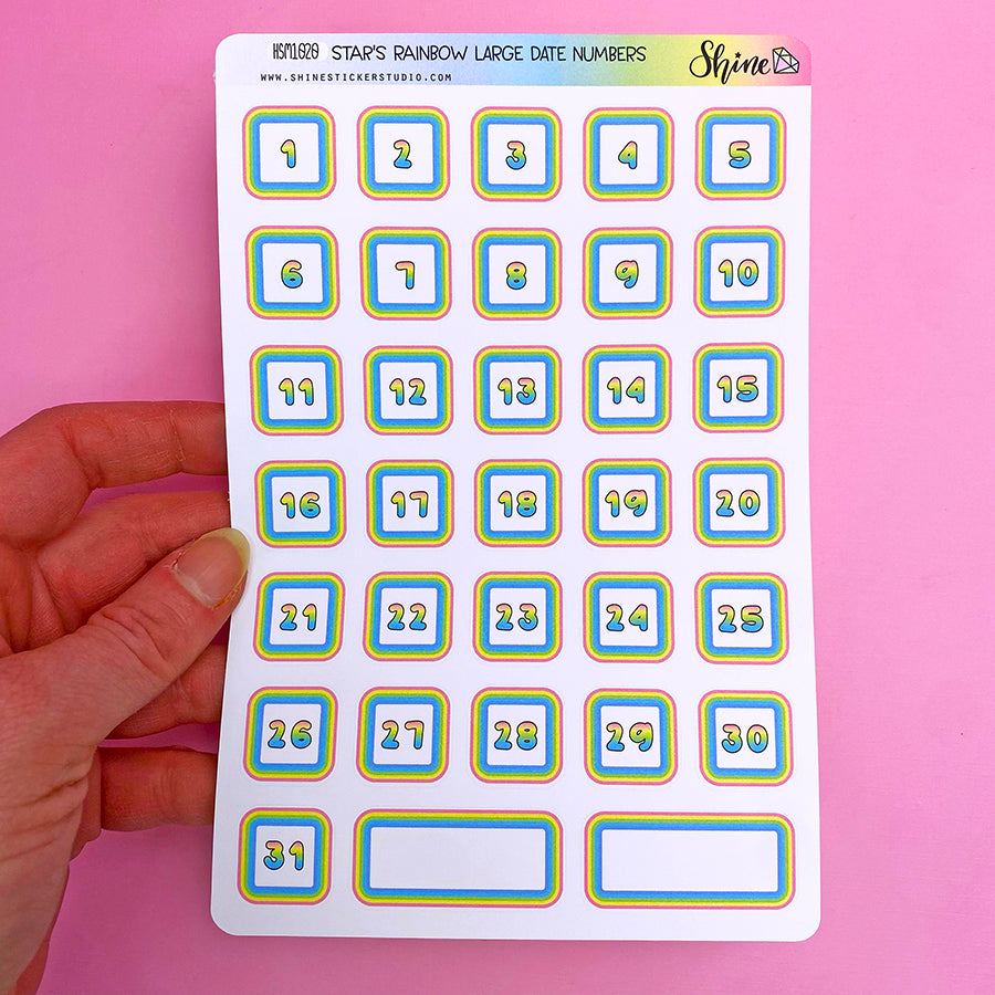 This listing is for decorative rainbow date number stickers that match our Star's Rainbow collection. There are a full month of stickers on the sheet, plus two extra blank box stickers. These are all .8" tall, just slightly more than three-quarter inch.