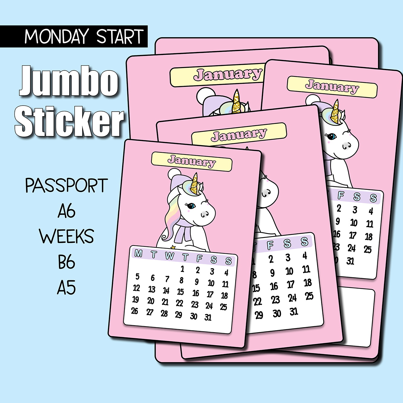 Use this big sticker to cover a page in your planner or bullet journal so you'll have the cutest spot for decorating each month of 2026! These are sized slightly smaller than the page, allowing for margins which makes for easier placement and centering. Choose your jumbo sticker sized from the following standard sizes: Passport, A6 (Hobonichi), Weeks (Hobonichi, TAS), B6, and A5 (Hobonichi Cousin).