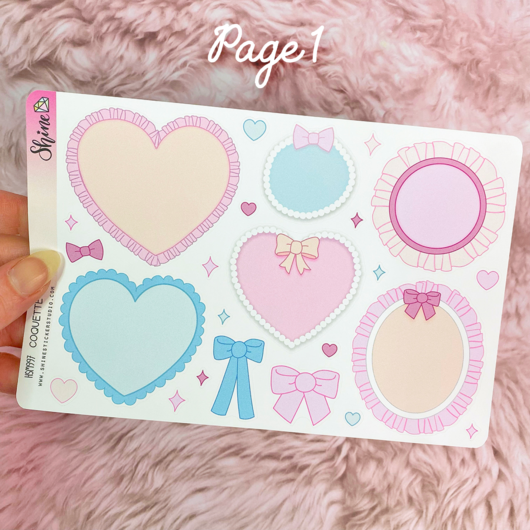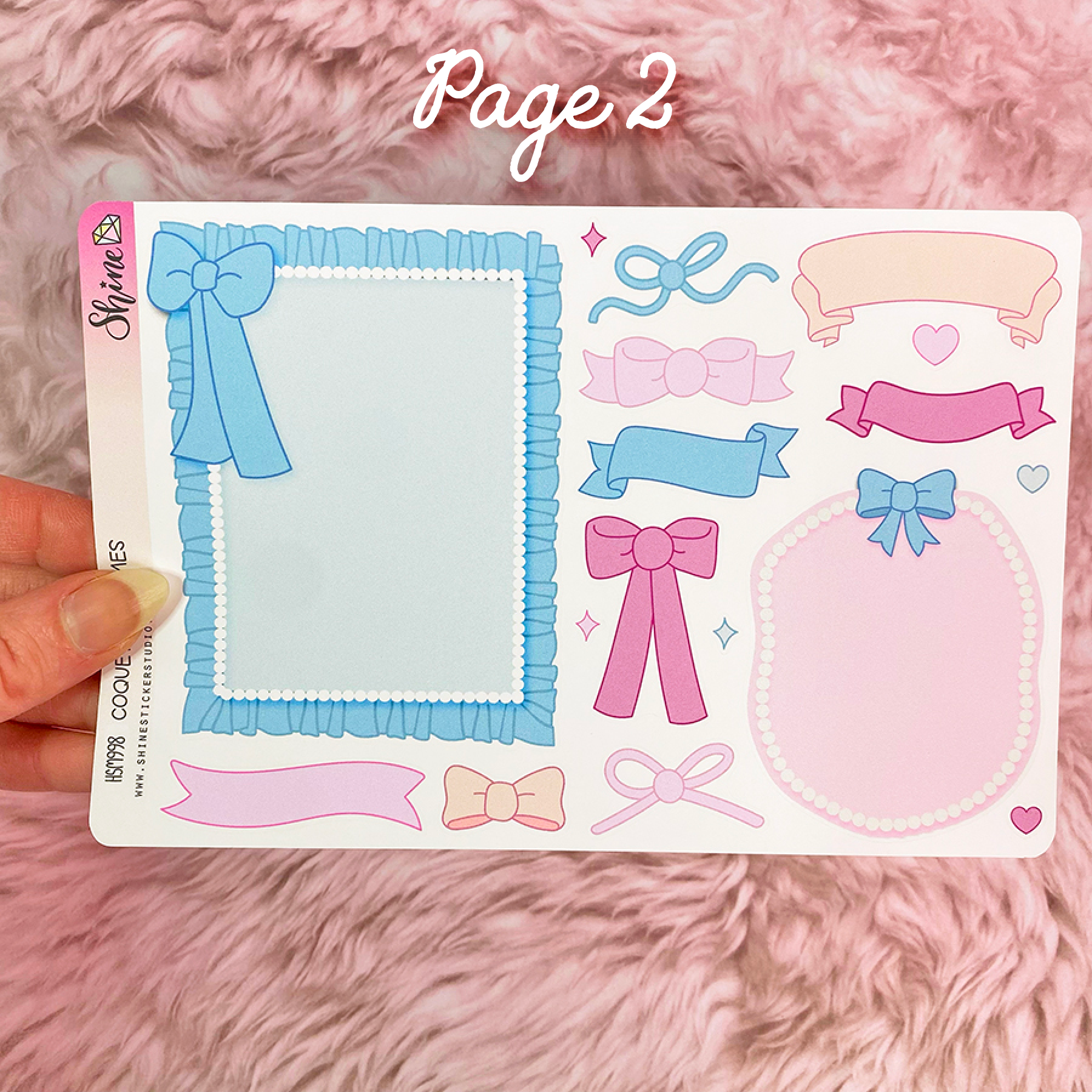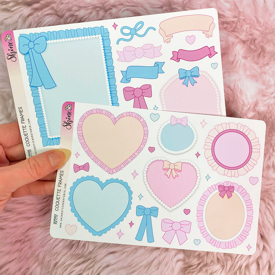 This listing is for a sheet of these super cute bujo style coquette frames, bows, and banners, in a variety of shapes, sizes, and colors. These stickers are on the larger size. You can write in them, journal, layer with other stickers, put pictures in them, etc. The large blue rectangle frame sticker is big enough for a 2x3" photo. Have fun with these!