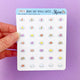 This listing is for one sheet of these cute small weekday stickers that match our Rainy Day collection. These stickers are about .3" tall and the longest one is 1.625", and there are enough stickers for three weeks on the sheet. The set on the bottom is abbreviated and sized to fit the Hobonichi weeks monthly pages.
