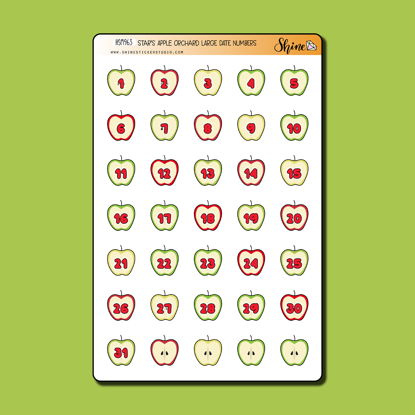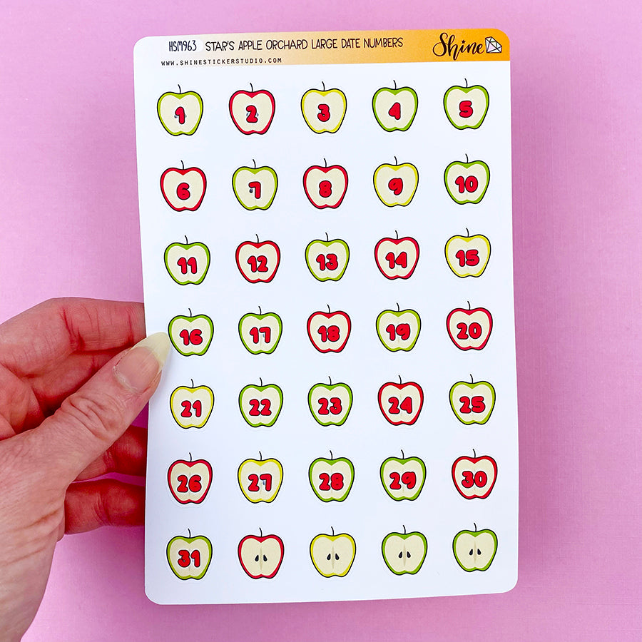 This listing is for decorative date number stickers that match our Star's Apple Orchard collection. There are a full month of stickers on the sheet, plus a few extra deco stickers. These date numbers are about .65".