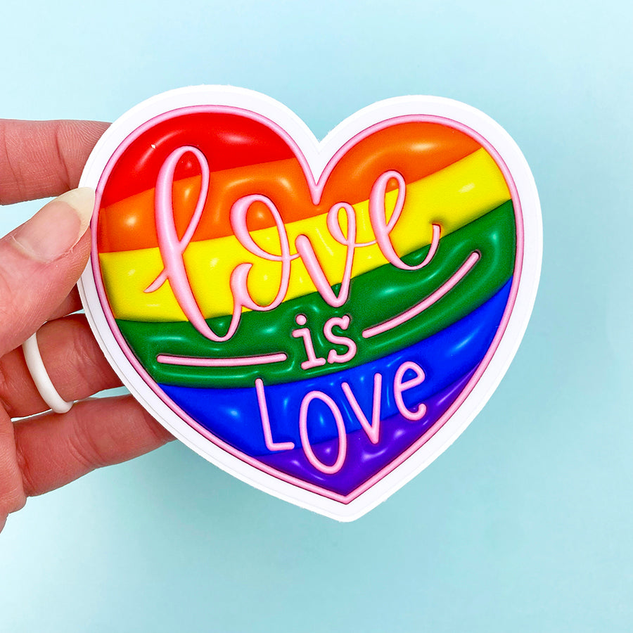 This is a Pride decal featuring hand-lettered "Love is Love" with a rainbow heart background, all in a 3D inflated effect. These are laminated.