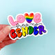 This is a laminated decal featuring the word "Love" with a rainbow Pride heart for the V, printed on holographic vinyl.