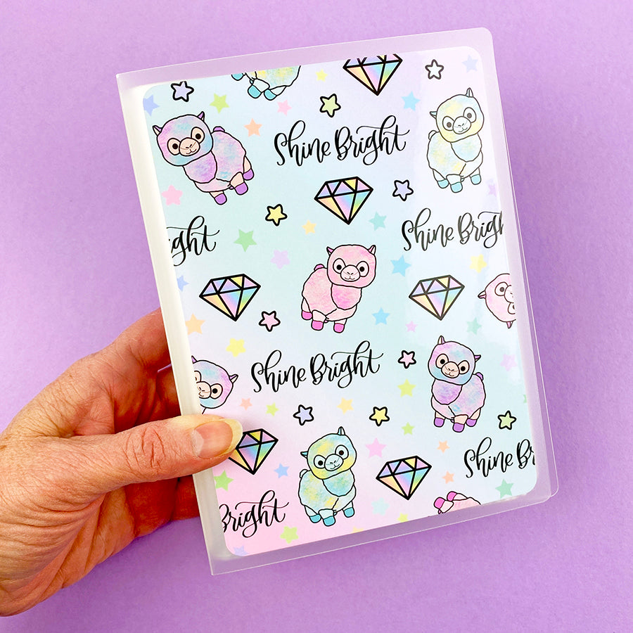 This listing is for one planner sticker album, with 5" x 7" pockets featuring cute hand drawn llamas, our diamond logo, little stars, and "Shine Bright" lettering arranged in an eye-catching pattern against a pastel colored ombre background. The covers are laminated.