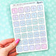 This listing is for a sheet of cute box stickers featuring dotted frames in alternating colors, perfect for writing in your plans! You can orient these either horizontally or vertically. Imagine the possibilities! The smaller ones are about 1.5" x 1.9" and the biggest one is 2.6" x 3.1".