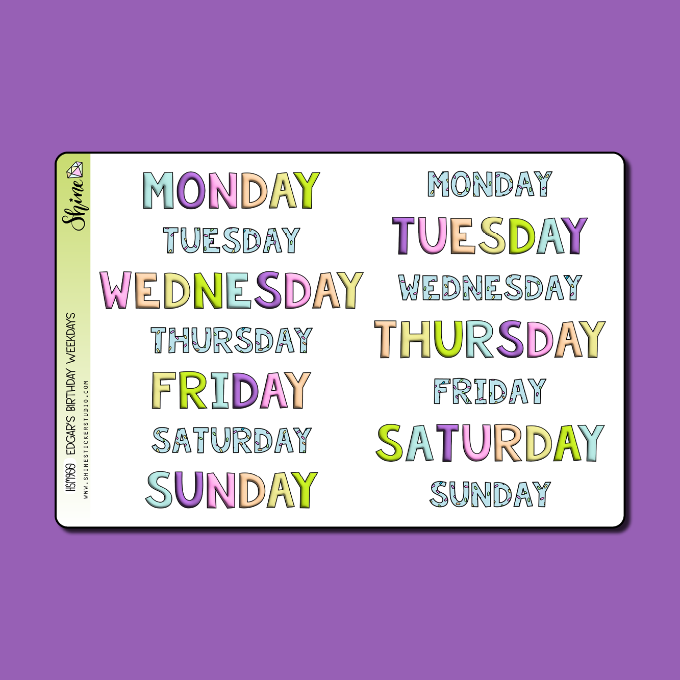 This listing is for a sheet of two sets of weekday stickers that match our Edgar's Birthday collection. The longest one is 3.4" long.