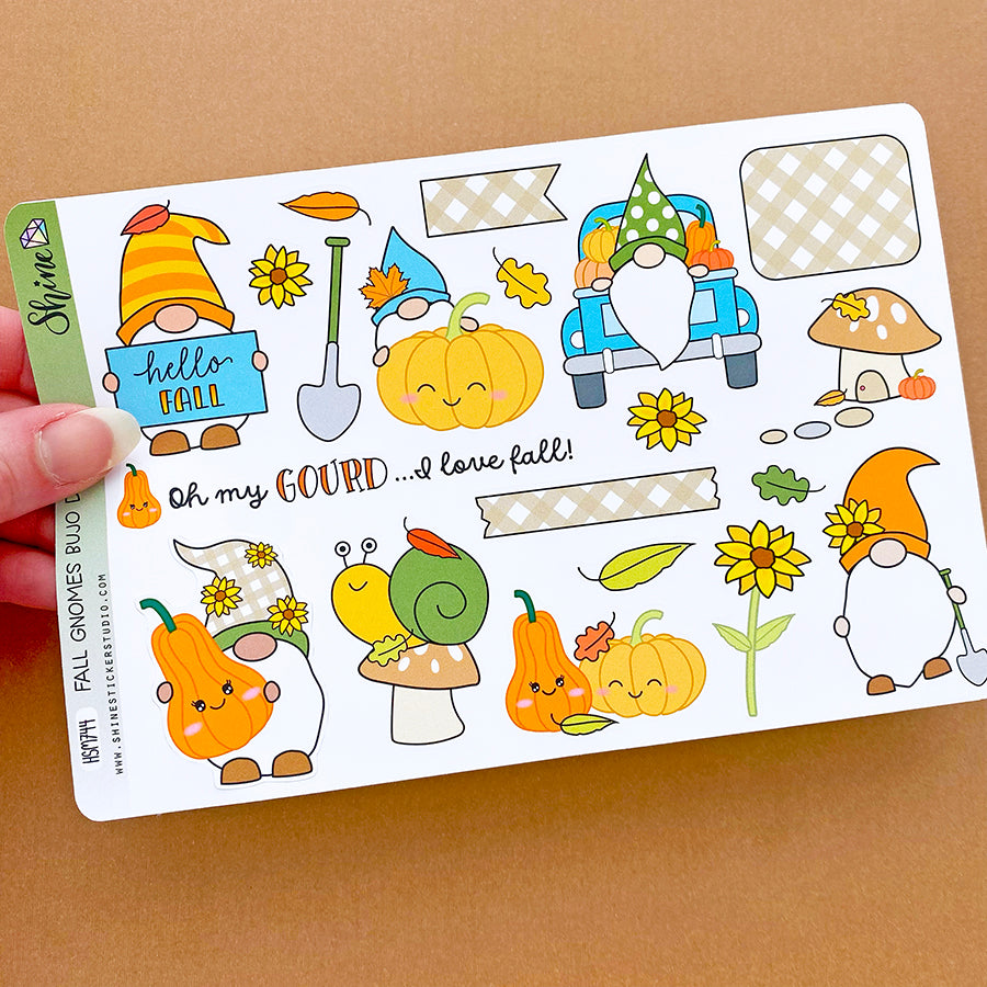 This listing is for a sheet of super cute stickers featuring fall-themed gnomes, perfect for celebrating the start of Autumn! These are designed for bujo planning (bullet journaling) where you can freestyle and get really creative with your planner page decorations. These stickers are larger than our quarter sheet sized deco stickers, and smaller than our die cut stickers. You can even write on some of them!