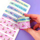 This is our black monochrome watercolor date cover washi tape which features holographic foil days of the week (Mon, Tues, Wed,...). Each roll is .5" tall (13 mm) and perforated at 1.5" to make the perfectly sized date covers for your planner.