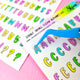 This listing is for these skinny alphabet stickers available in our traditional Shine pastel rainbow color palette. Each letter is about .5" tall. This sheet is for the vowels only, meant to supplement these: