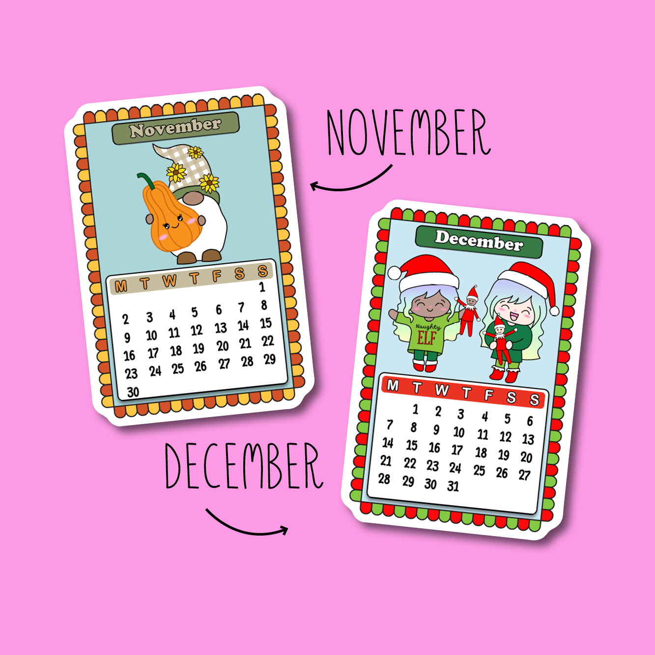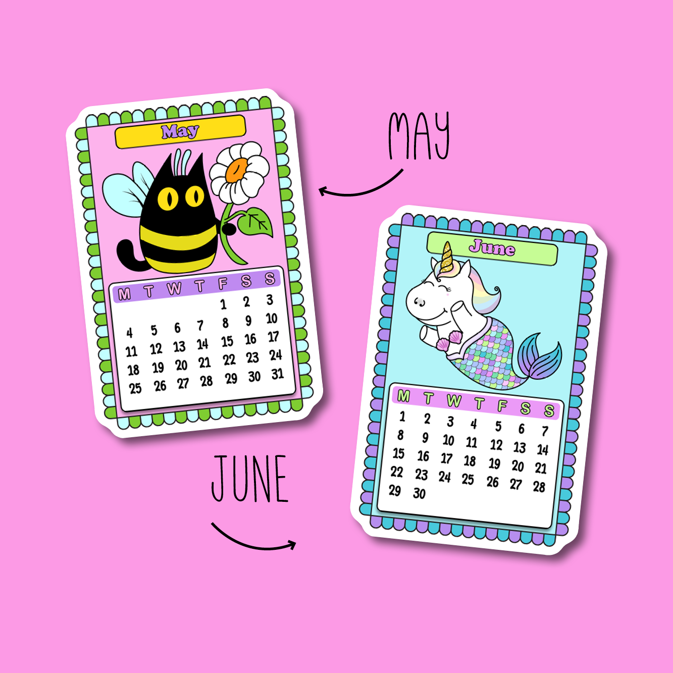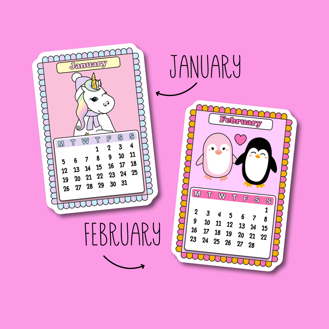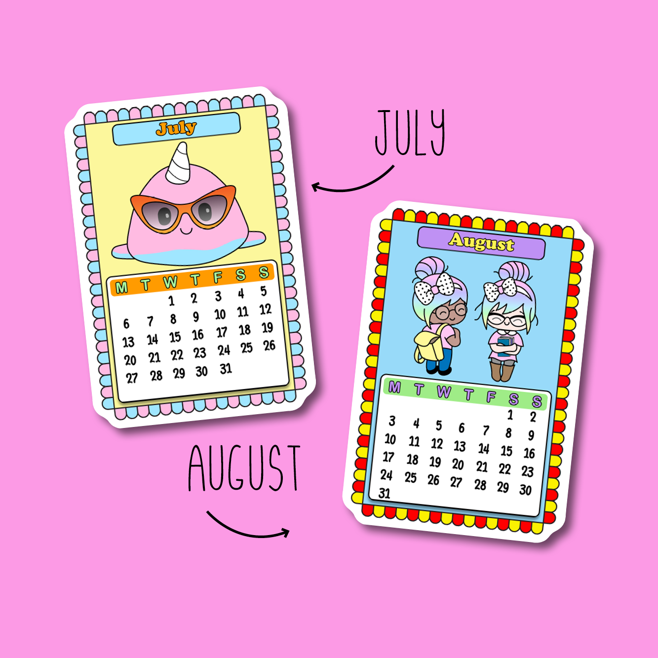 This listing is for our MONDAY start 2026 calendar sticker die cut collection featuring our hand drawn seasonal artwork and characters Luna, Star the Unicorn, Pickle and Popsicle, Edgar, Neylly and Ella too! Purchase individually or get all 12 months for a discounted price! Each die cut is about 2x3".