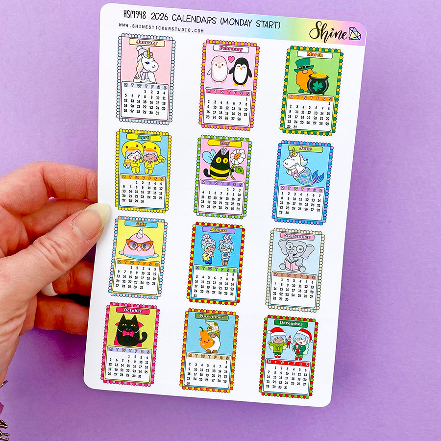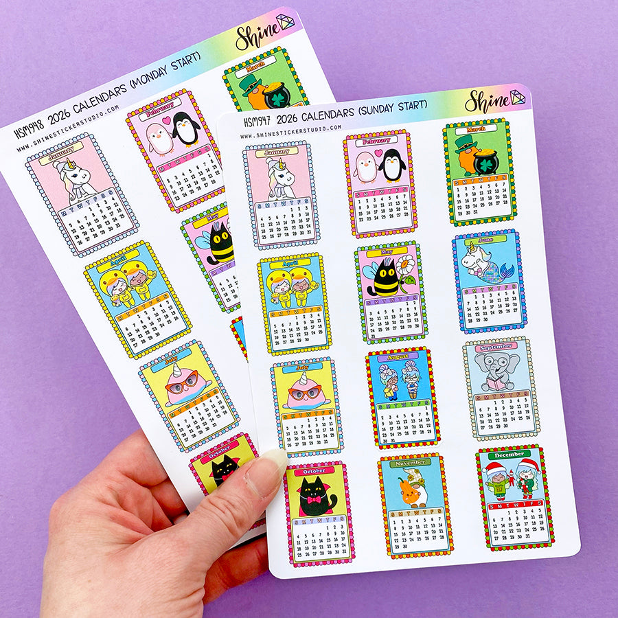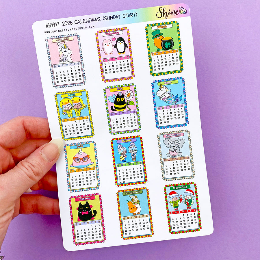 This listing is for a sheet of little 2026 calendar stickers featuring our seasonal artwork and shop characters Luna, Star the Unicorn, Pickle and Popsicle, Edgar, and Nelly and Ella too! These are a little over 1 x 1.5".