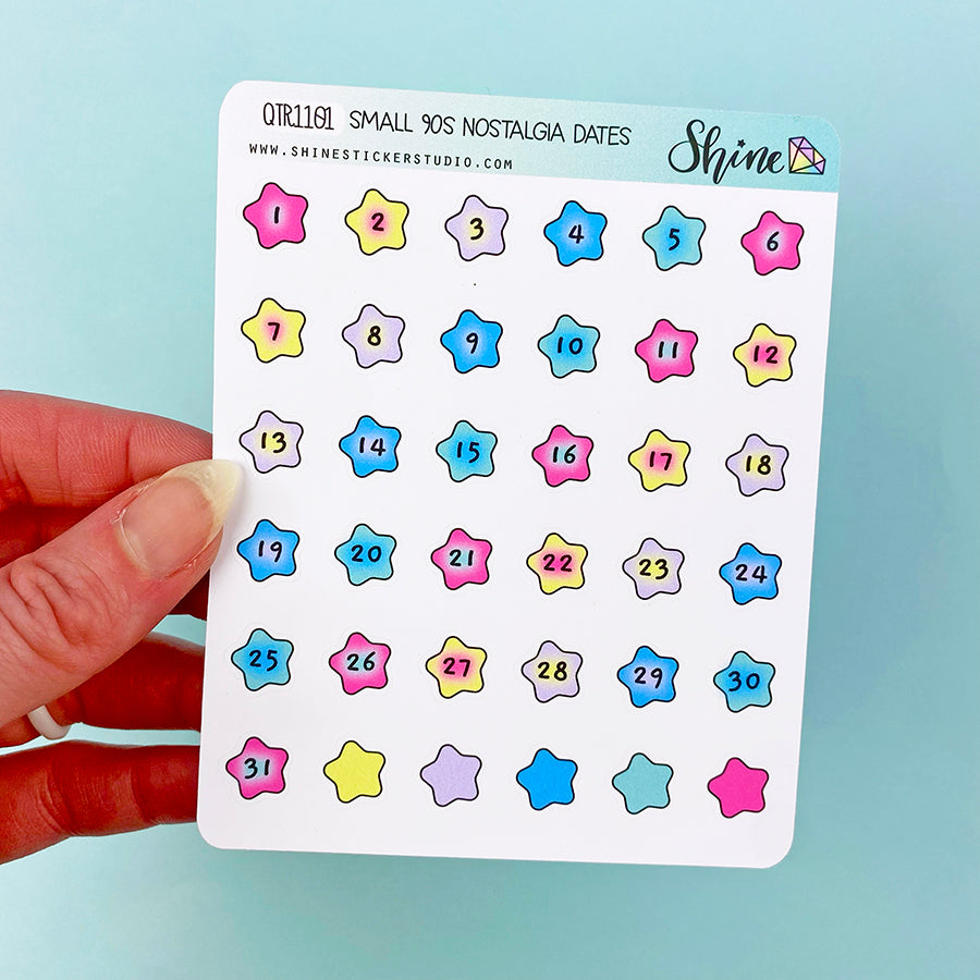 This listing is for one sheet of color star number stickers that match our 90s Nostalgia collection. There is one month's worth of numbers on the sheet (1-31) plus four blank stars. Approximately .5" tall.