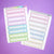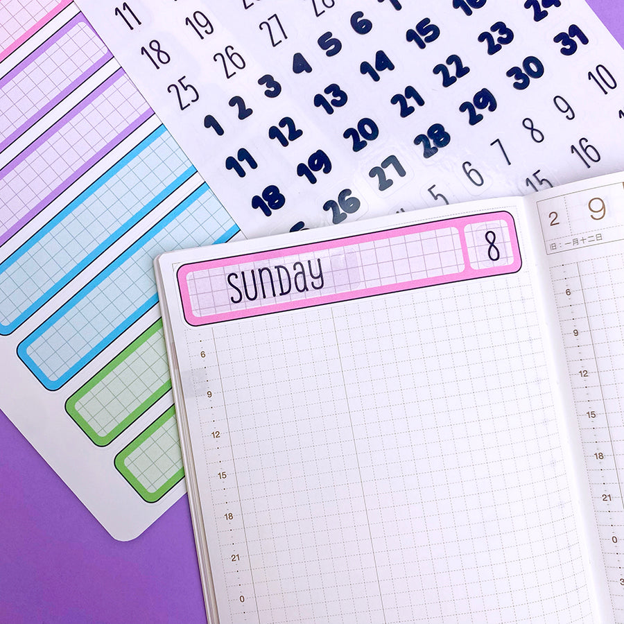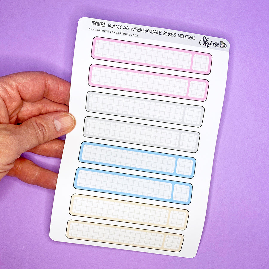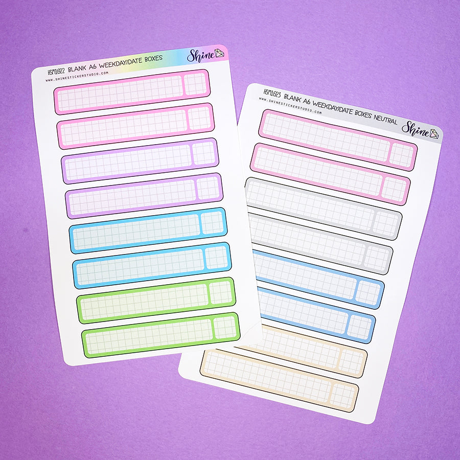 This listing is for a sheet of blank weekday and date number box stickers formatted to fit the A6 planner, but these can be used in just about any planner. Each box has a space to write in the weekday and the date. Choose between our classic color palette or our neutral color theme. There are eight boxes on the sheet for four daily spreads, approximately 3.75" long by .75" tall.