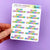 This sticker sheet features the words "Happy Anniversary" in rainbow colored bubble letters. There are some all on one line at .27" tall by 2" wide and some on two lines at 1.6 wide. There are 12 stickers on the sheet.