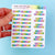 This sticker sheet features the words "Happy Birthday" in rainbow colored bubble letters. There are some all on one line at .27" tall by 2" wide and some on two lines at 1.17 wide. There are 16 stickers on the sheet.