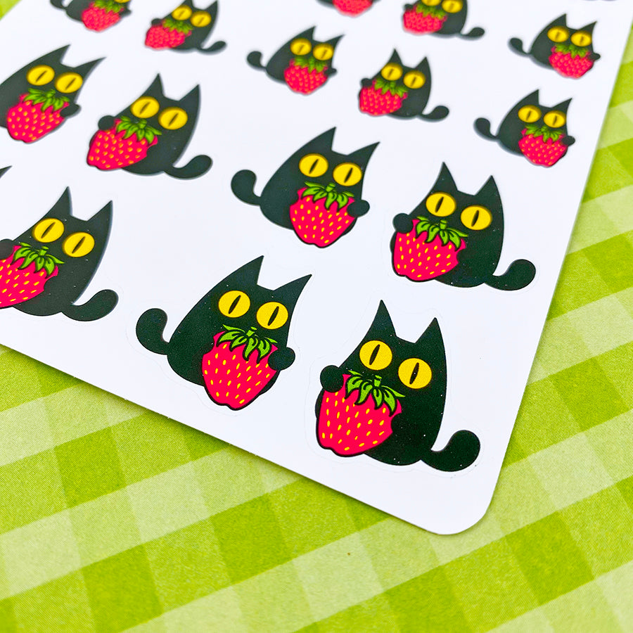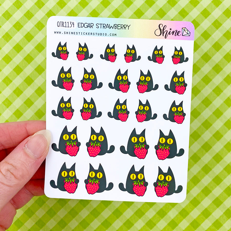 This listing is for one sheet of these adorable kitty cat stickers featuring our Character Edgar holding a delicious strawberry. Yummy!