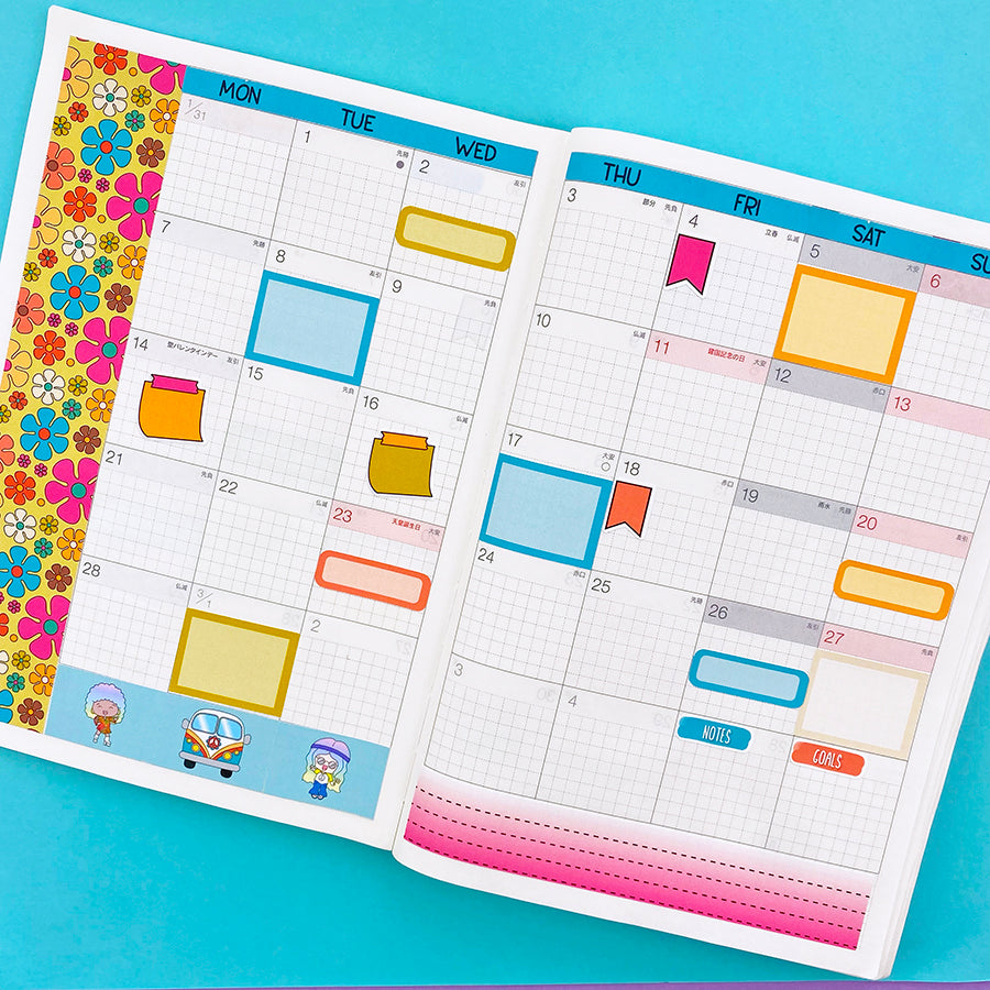 This is a rad monthly kit featuring elements from our Feelin' Groovy collection, formatted for the Hobonichi Cousin monthly pages.