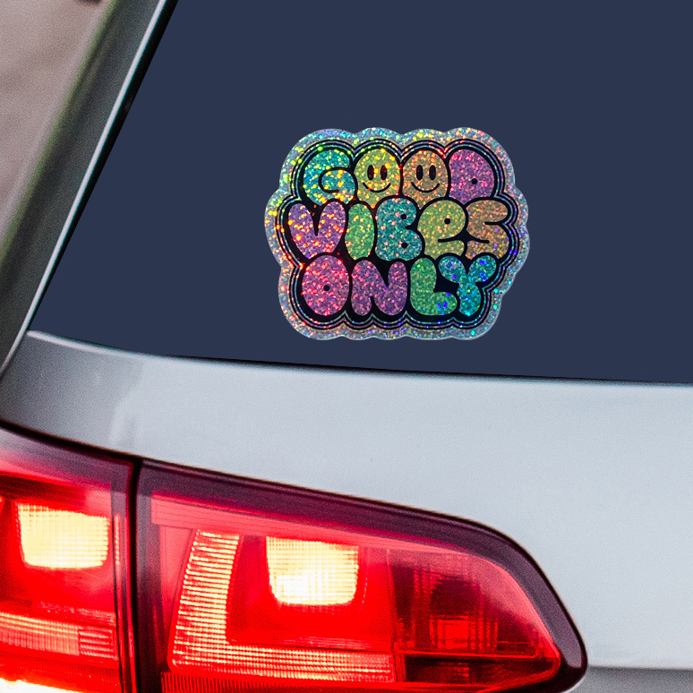 This is our holographic sparkle media with permanent adhesive, laminated for protection. Guaranteed to last up to two years.