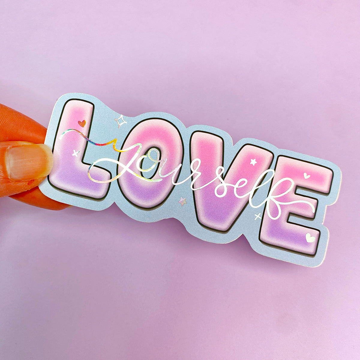 This listing is for one holographic FOIL sticker die cut featuring our "Love yourself" handlettering. These are printed on our premium matte sticker paper and are approximately 4.25" wide.