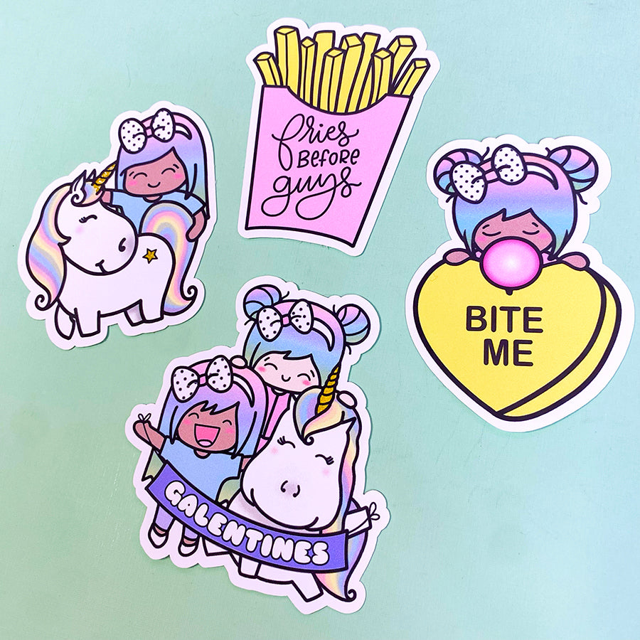 This is our original Luna Valentine Die Cut Collection. Purchase individually or get all 4 die cuts for a discounted price! These are hand-drawn and our original design so you can't find them anywhere else! Choose light or dark skin tone for Luna. Each die cut ranges from 2.5" - 3.5" on the longest side.