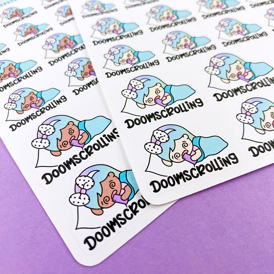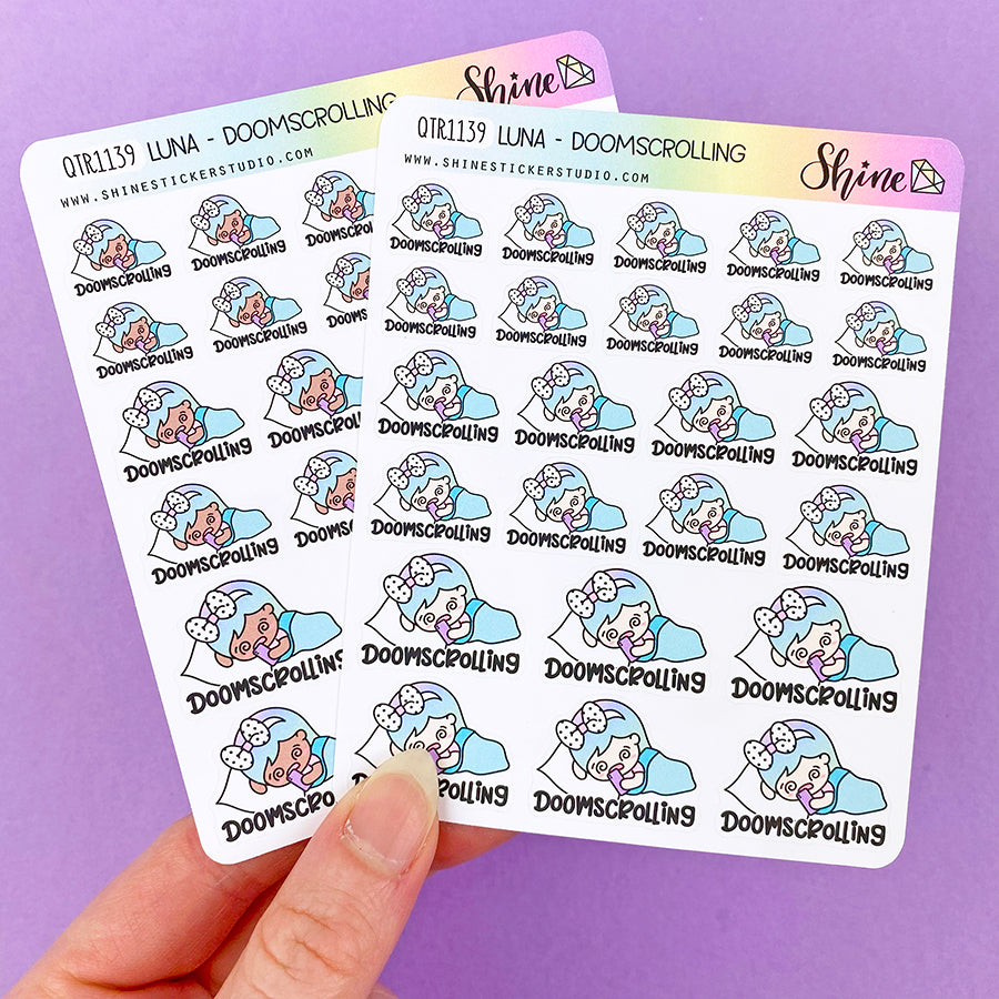 This listing is for one sheet of these adorable stickers featuring our character, Luna lying in bed doomscrolling endlessly on her phone... like so many of us do. LOL. The word "Doonscrolling" is underneath but you could cut that off if you don't need it.