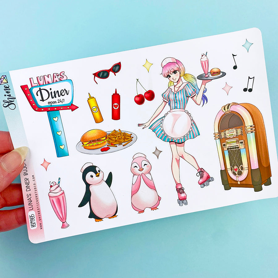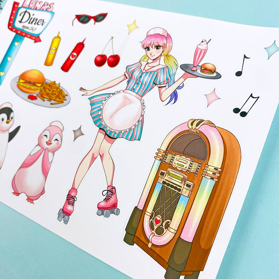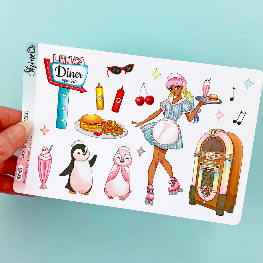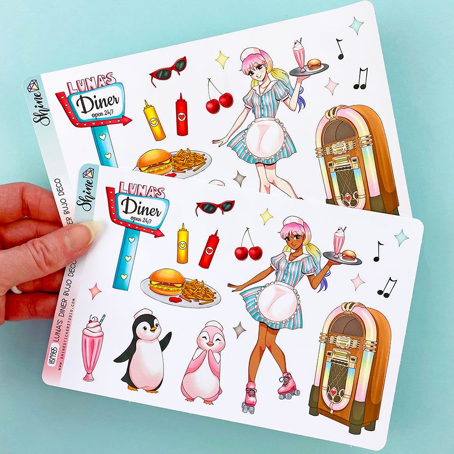 This listing is for a sheet of these absolutely stunning decorative stickers featuring our shop character Luna in a 50s diner theme, with her pals Pickle and Popsicle, too. All artwork created by Ginny, Team Shine's youngest designer.