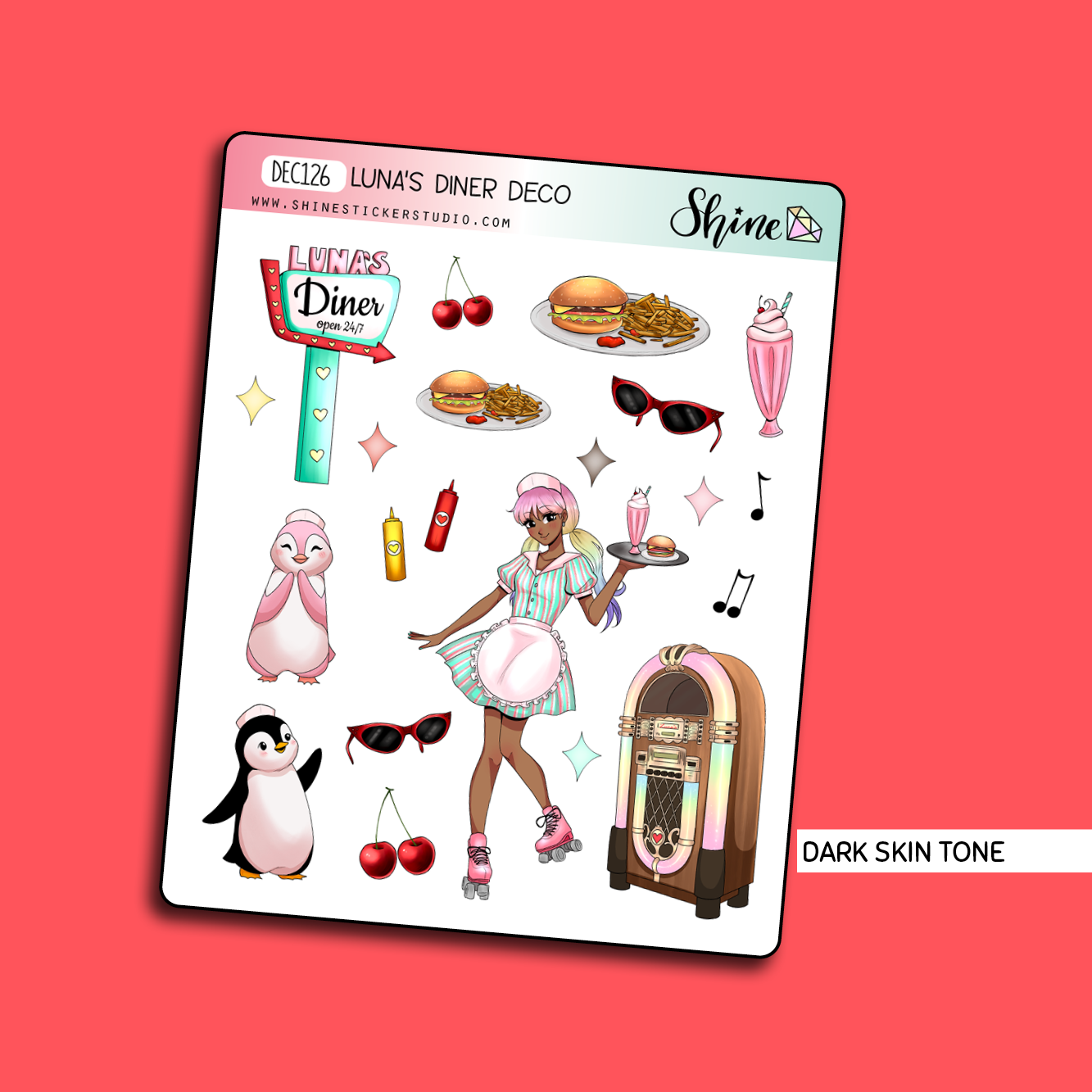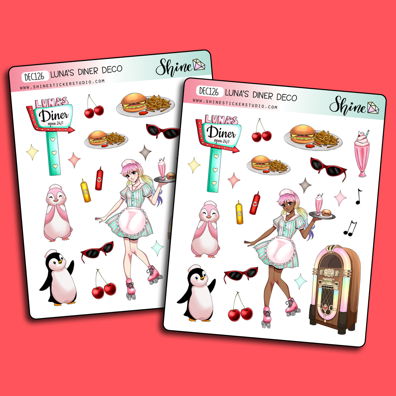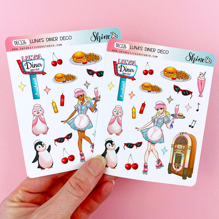 Step into the charm of the 1950s with our Luna's Diner collection. Featuring our adorable characters Luna, Popsicle, and Pickle, these stickers bring a fun diner vibe to your planner. Perfect for adding a nostalgic touch while keeping your week organized with style and personality.