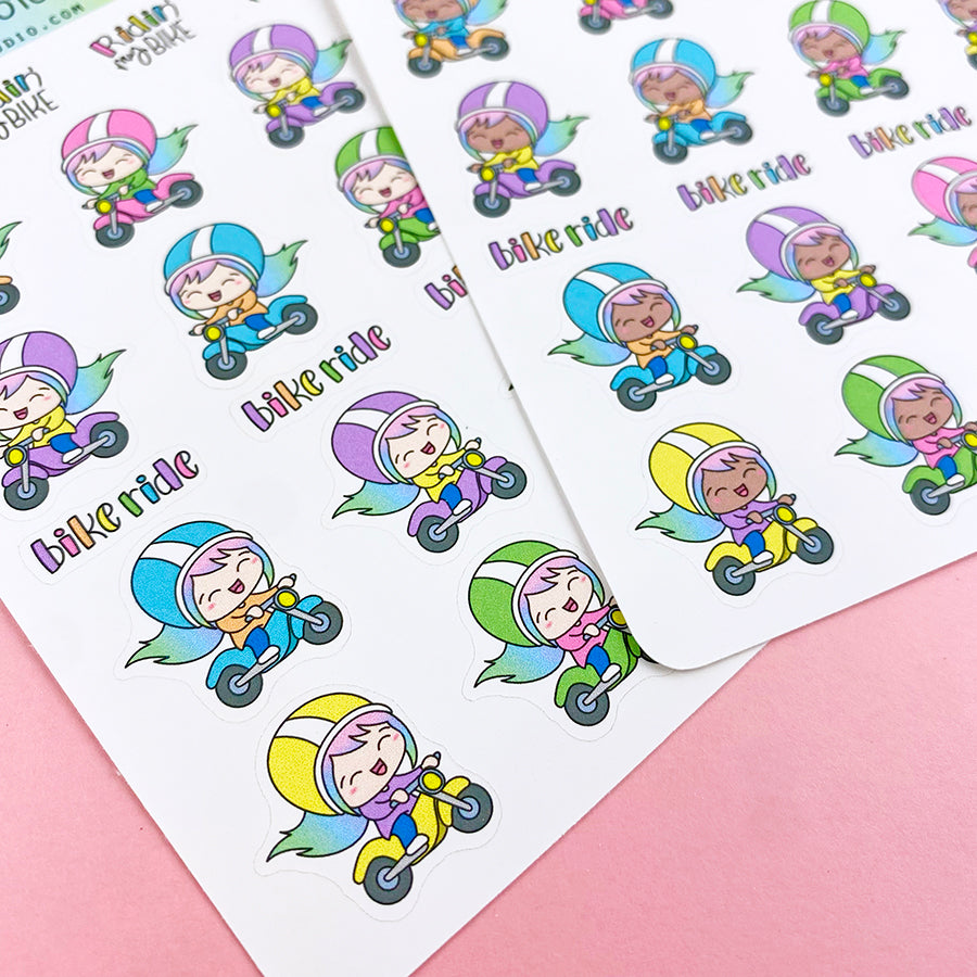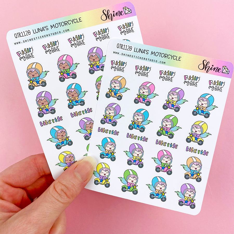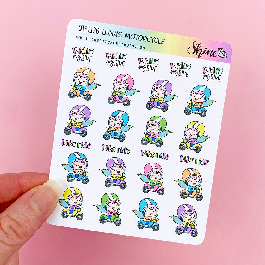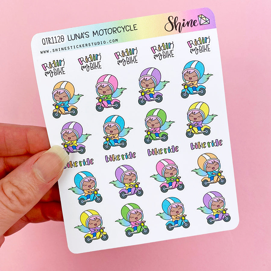 This listing is for one sheet of these adorable stickers featuring our character, Luna riding a motorcycle, plus some hand lettered "Ridin' my Bike" and "Bike Ride" stickers. These stickers will fit most planners.