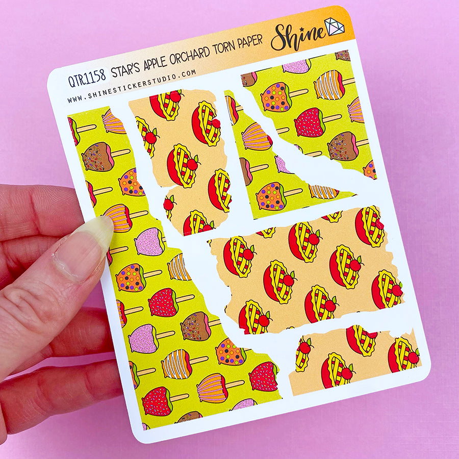 This sticker sheet features torn paper stickers in a variety of sizes. The patterns match our Star's Apple Orchard collection. These will work for most planner sizes and journals. Write in them and/or layer with other stickers, washi, die cuts, etc! Creative possibilities are endless.